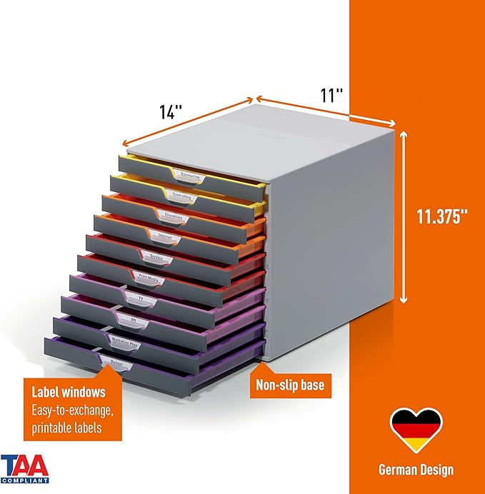 Durable Varicolor 10 Drawer Unit - Gray Desktop Drawer Set with 10 Color Coded Draws - Letter to Folio Size Files - Perfect for Storing Documents and Paper Work