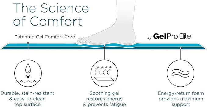 - PATENTED GEL TECHNOLOGY! GelPro Elite features a ¾” core of soothing gel + energy-return foam which dramatically reduces stress, fatigue & discomfort while standing.
