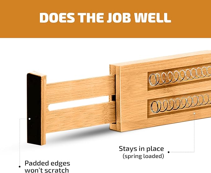- STRONG SPRING: The drawer separators really bring organization into your home, because they don’t wobble or move out of place; With the spring mechanism and foam padding, the wood dividers stay firmly in place