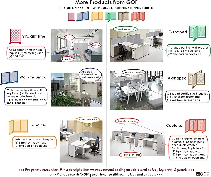 - Includes One Set of <36"D x 96"W x 72"H> L-Shaped Freestanding Partition, consisting of One 36"w x 72"h Panel, Two 48"w x 72"h Panels, 2 End Bars, & 1 L-Post