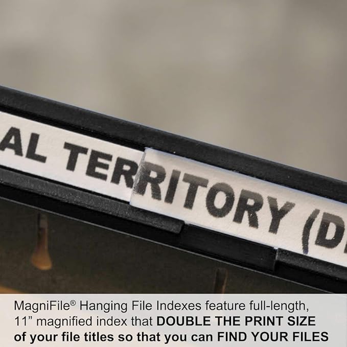 - FIND YOUR FILES FAST β Standard file folder labels are too small, hard to read, and often need replacing. 11" long MagniFile Magnifying indexes DOUBLE THE PRINT SIZE of your file labels and provide more space for detailed file descriptions