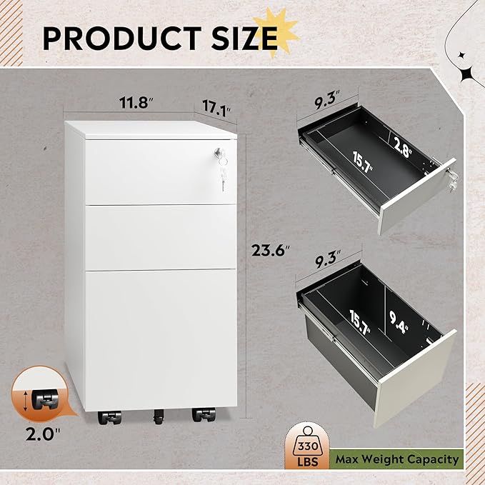 - Slim Width File Cabinet: The 'drawer pulls' is simply a full height design recess on both sides allowing opening from either side and the drawers are impact-resistant for increased safety. Overall dimension: 11.8"W x 17.1"D x 23.6"H.