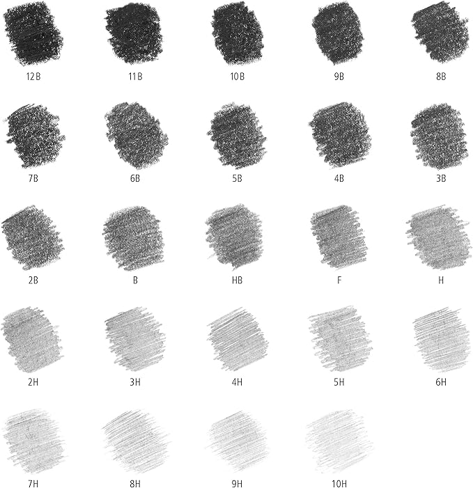 - 24 finely graded degrees: from super-soft and dark 12B on up to hard, light 10H for the widest possible range of shading and opacity. All packaged in a durable tin case for organized portability