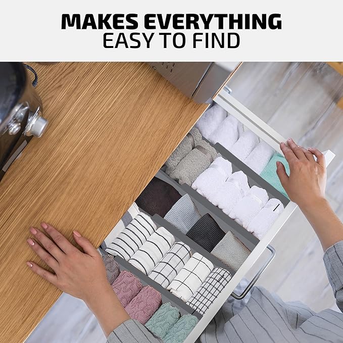 - ✅ EASY & SECURE INSTALLATION: Quickly install these gray dividers without the need for tools. The strong, spring-loaded mechanism ensures they remain firmly in place, even with daily use. Additionally, the EVA foam at each end prevents slipping and protects your drawers from scratches or pressure damage, ensuring both stability and safety.