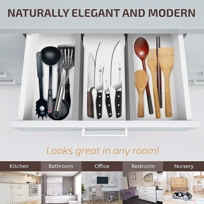 - ✅ MEASURE FOR PERFECT FIT: Ensure the size will work for your drawer by measuring your drawers before ordering. Our drawer dividers adjust from 16" to 22" and stand 2.6" high, making them perfect for both shallow and deep drawers. Available in four stylish colors—natural, white, grey, and black—they blend seamlessly into any décor.