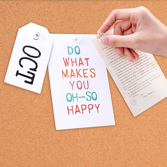 - Resilient cork board construction features a self-healing surface that doesn’t leave holes when items are pinned and removed