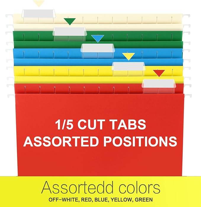 - HANGING FOLDERS SET: Contains 30 extra capacity folders with 30 cardboard supports, 36 printable label sheets and comes in 5 assorted primary colors (off-white, red, blue, yellow, and green) to make color coded filing a snap.