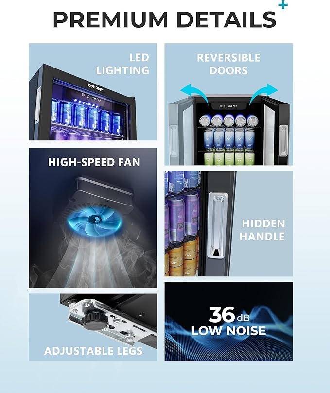 - QUIET + ADVANCED COOLING SYSTEM - With a powerful compressor and internal air-cooled system, Euhomyβs mini fridge creates an evenly cooled space by ensuring that air flows throughout the entire beverage center.In addition, ultra quiet cooler of beverage cooling machine doesnβt affect your daily rest or working. With our cooler, you wonβt just enjoy cold drinks, youβll have a quiet atmosphere too