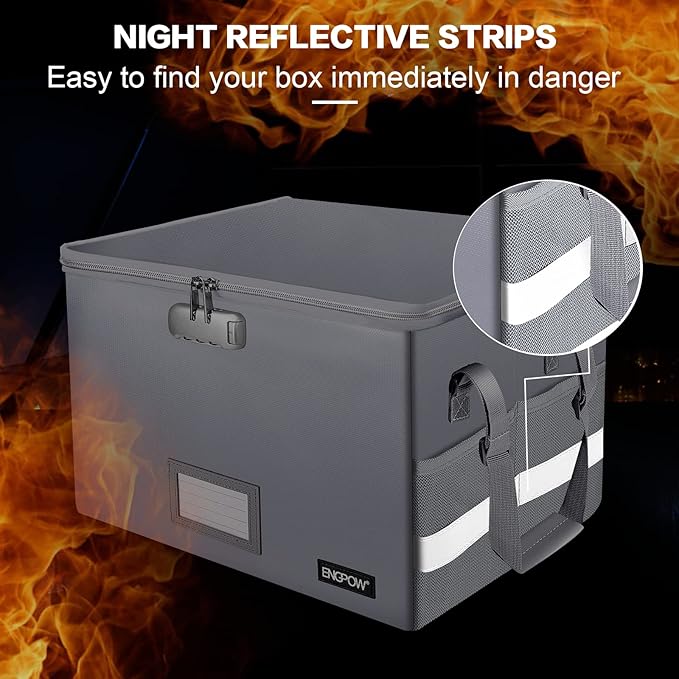 - Anti-static and reflective strip design:Are you still worried about the storage box is often covered with dust? The anti-static material can prevent dust from sticking to the outside of our fireproof box, always keep it neat and tidy.The reflective strip design on the side of the box allows you to immediately find your fireproof box even at night, protecting irreplaceable documents and valuables from fire.