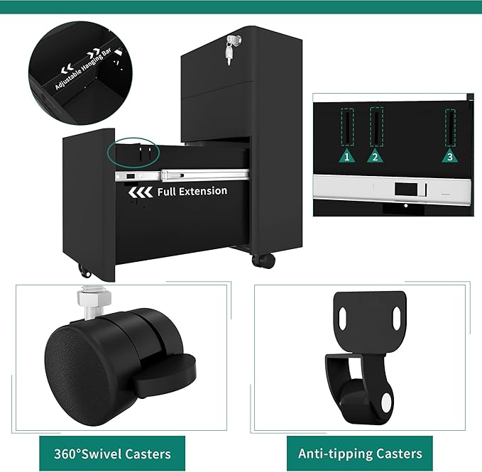- 【Free-range Mobility with 5 Casters】This lockable filing cabinet has 4 x swivel casters (two of them are lockable) + 1x anti-tipping central caster; Easy and safe to move! 360°swivel casters provide great multi-directional mobility with little effort