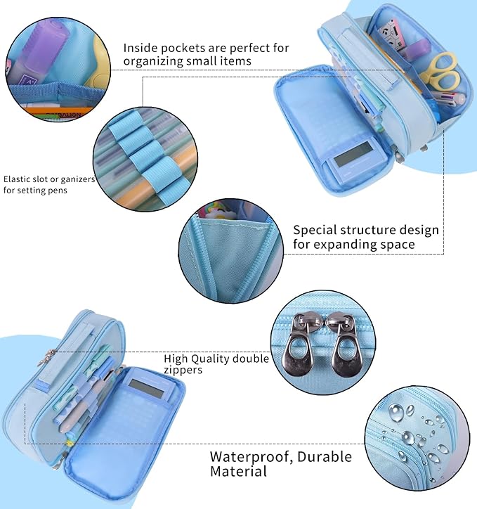 - Multi-storage – Two double-zipper openings with 10 mesh pockets, 7 pens elastic loops, 2 inner zipper pockets, will definitely keep all stuff neat tidy; can hold 60-80 pens or similar items