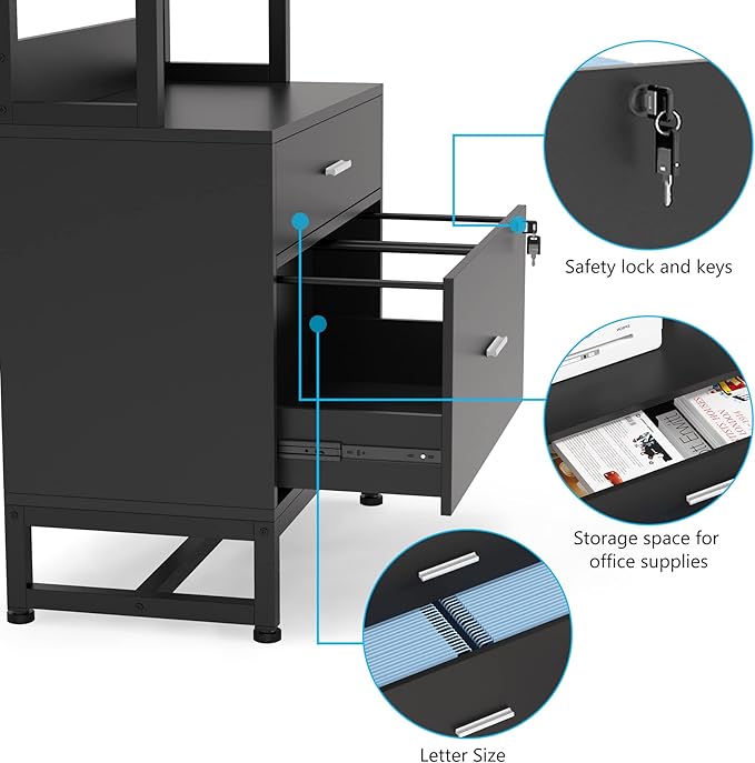 Tribesigns 2 Drawer Vertical File Cabinet with Lock & Bookshelf, Letter Size Large Modern Filing Cabinet Printer Stand with Open Storage Shelves for Home Office, Black