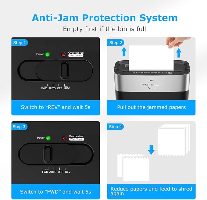 - Overheating Protection & Anti-Jam System: 4 mode control switch (Forward, Auto, Off, Reverse) and LED light indicators (Power On, Overheat); Overheating (Red Light On) protection makes it safer to use; Anti-jam system helps to clear paper jams