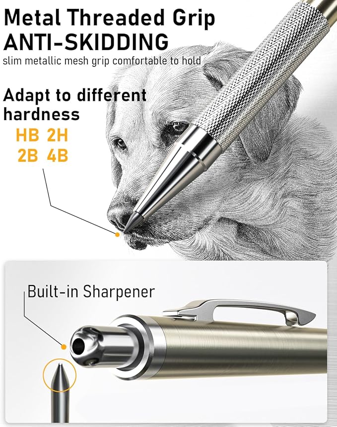 - 2 PCS 2mm Lead Holder: Metal Threaded Anti-skidding pen tube with sharpener in the cap of 2.0 mm mechanical pencil, Extra 2pcs lead sharpener are also provided for the 2.0 lead to keep the fine point as they dull.