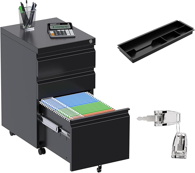 Aobabo Steel 3 Drawer Mobile File Cabinet with Lock, Under Desk Metal Filing Cabinet, 23.6''H A4/Legal/Letter Size Fully Assembled Except Wheels, Black