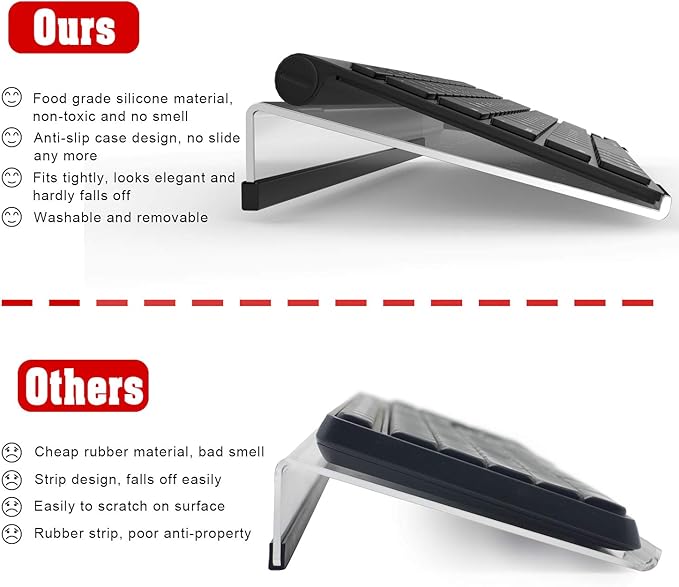 - Non-Slip Silicone Strip - Environmental friendly non-toxic and odorless anti-slip silicone material instead of using cheap rubber strip that fully wraps the light weight small keyboard stand from bottom back protects your desk table from scratching. Safe, sturdy and no slipping. Looks good with black and silver home office decor.