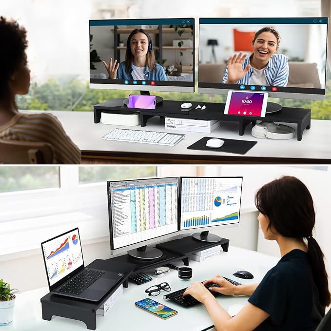 - 【Details Design for Use】Each computer monitor stand has a wide and deep tablet holder in the front of the top. The monitor shelf for desk fits for pencils or phone.Also there is a cut on the back,so the cables won't be easily in a mess or become an obstacle between wall and the shelf.Moreover, the leg base is attached with anti-slip mat, enhancing the stability of the stand.If you have any problems with the assembly, please consult us!