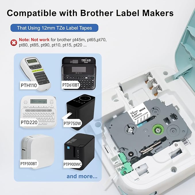 - Lasting & Practical Laminated Tape: Compatible with Brother TZ tape 12mm 0.47 laminated clear is enduring, self-adhesive and print clearly. Resistant to water, oil, fade, abrasion, chemical, heat and cold.