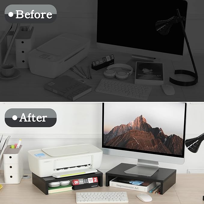 - Prefect Office Partner: These 2 classic black stand can meet your 3 needs one time: ★Raise 2 monitors/laptops/printers/game boxs ★Relieve fatigue ★Increase storage space.