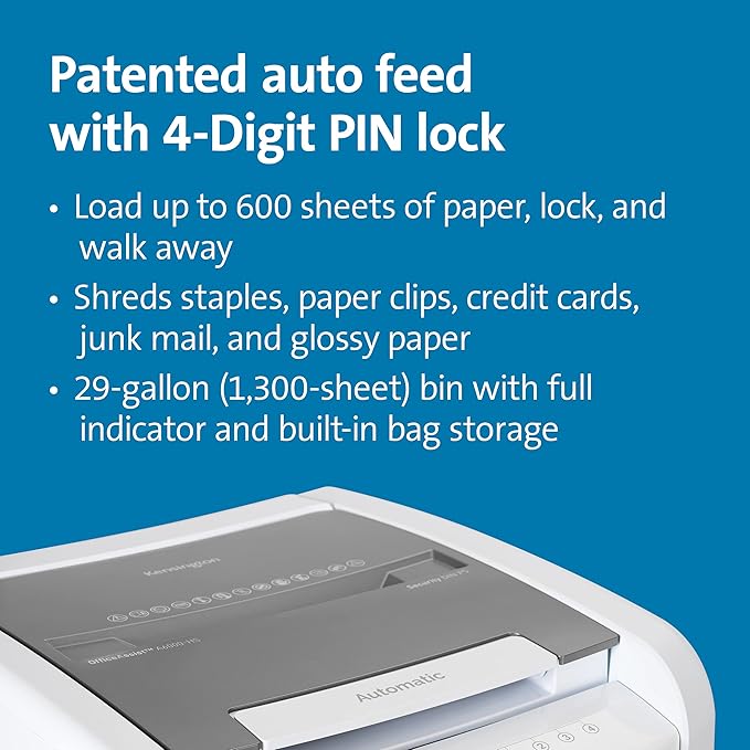 - Patented auto feed with 4-digit PIN lock lets you load up to 600 sheets of paper, lock it until shredding is complete, and walk away. Shreds staples, paper clips, credit cards, junk mail, and glossy paper