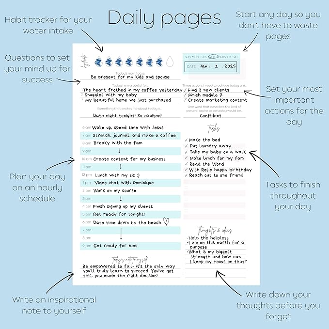 - KEEPS YOU FOCUSED ON SUCCESS: There are tons of sections in your goal planner organizer! Meal planner notebook, water tracker, gratitude prompts, weekly review, daily/hourly schedule, motivational prompts, goal pages, blank pages for a reflection journal, 90 day goal, storage pockets and more!