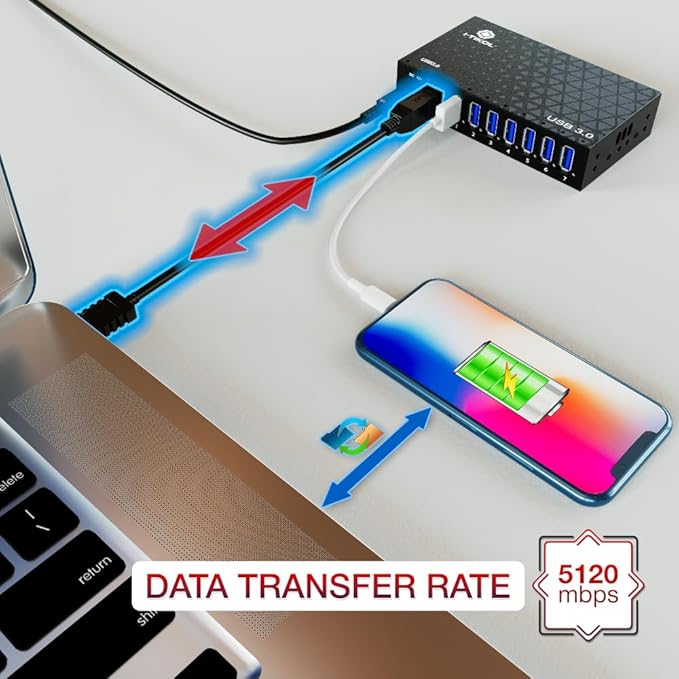 - SUPER SPEED USB 3.0 HUB - 7 Port USB 3 Hub Charger & Data Transfer has a stable Speed of up to 5Gbps. The specification of USB 3.0 has been made by the Industry Standard with total Consumption of up to 900mA, that’s allowing this Hub to charge 7 Devices simultaneously, without loss of Speed & Power. 3 form 7 Ports from USB Splitter are fast Super Charging Ports. IMPORTANT: USB 3.0 Ports are compatible with any USB 2.0 Device.
