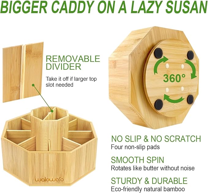 - BAMBOO PRODUCT - You will like the natural bamboo design. With its natural color and beautiful texture design, the rotating caddy fits for different style of decor. Also, available stained or painted if you prefer to.