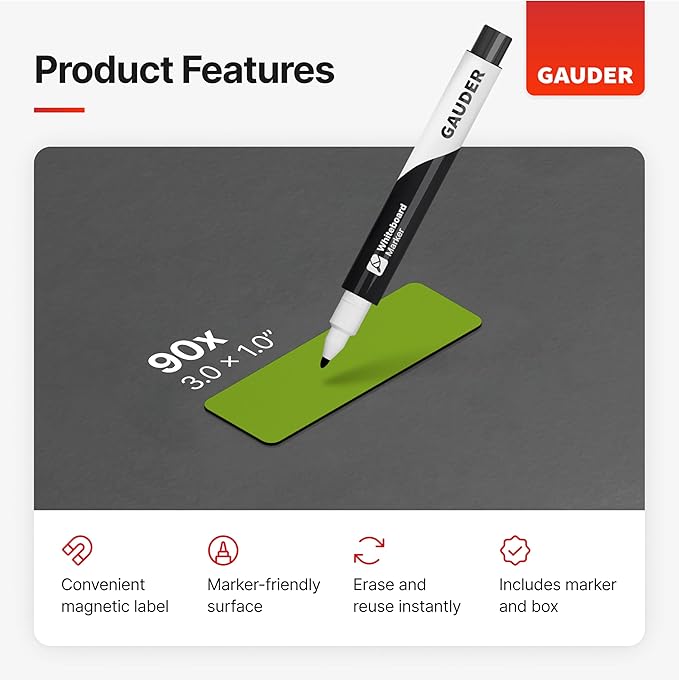 - REUSABLE AND SUSTAINABLE: GAUDER magnetic labels can be written on with the included whiteboard marker and reused repeatedly.