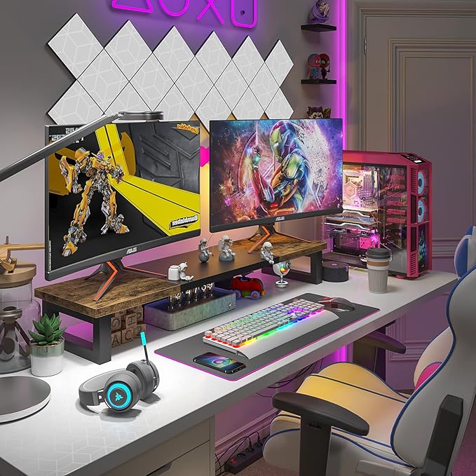 - 【Monitor Stand for 2 Monitors】This stand is an ideal choice when you need computers to work together. Unique original design products,this dual-monitor stand features a sturdy construction black with a rustic brown wood finish for an added rustic and unique look.