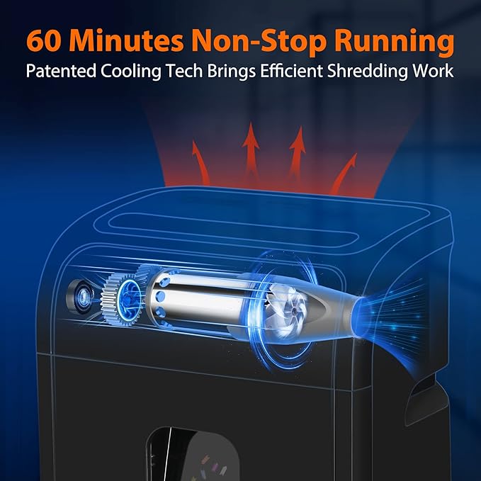 - 60 Mins Extra Long Working: Equipped with patented cooling system, this shredder features extra fast shredding speed with 60 minutes continuous running. For safety concern, if it keeps shredding over its maximum working time, shredder will be overheating. After 60 minutes cooling cycle, it can work again. Also equipped with auto thermal protection and FIVE LED indicators for safe shredding work