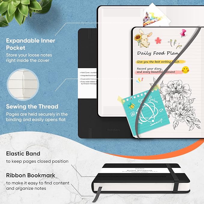 - Expandable Pocket + Elastic Closure Band+ 1 Ribbon Bookmark - The elastic band is strong and the page marker comes in handy. It has a handy-dandy pocket in the back to keep business cards, notes, receipts and other small paper items. Huhuhero notebook will provide perfect writing experience, great for bullet jounaling, studying, journaling, note taking, daily planning, drawing. Premium college supplies, office supplies, art supplies.
