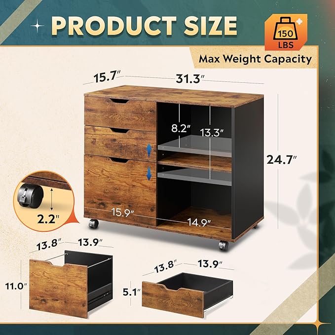 DEVAISE 3-Drawer Wood File Cabinet, Mobile Lateral Filing Cabinet, Printer Stand with Open Storage Shelves for Home Office, Rustic Brown