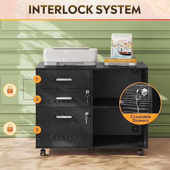 DEVAISE 3-Drawer Wood File Cabinet with Lock, Mobile Lateral Filing Cabinet, Printer Stand with Open Storage Shelves for Home Office, Black