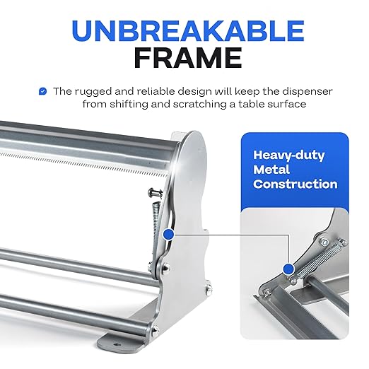 - 【THICK METAL FRAME】 This heavy-duty paper roll dispenser has a durable thick metal frame. Intended for long-lasting frequent usage. The rugged and reliable design will keep the dispenser from shifting and scratching a table surface