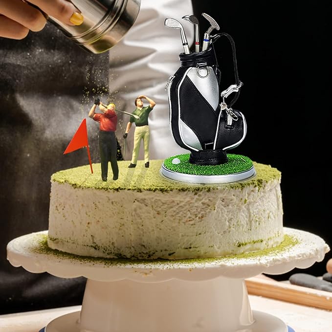 - GOLF GIFTS FOR MEN, GOLF PEN HOLDER FOR DESK, UNIQUE & NOVELTY SET: The mini golf bag pen holder placed on the base of the miniature golf putting green, with 3 mini golf club pens and 1 miniature golf ball.