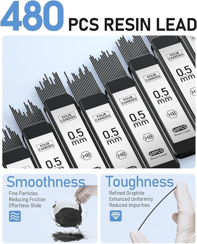 - 480PCS Resin Lead: 8 tubes of 60pcs super capacity leads; The stronger resin lead which doesnβt require sharpening and is not easy to break, provides ultra-smooth writing and clear dark lines