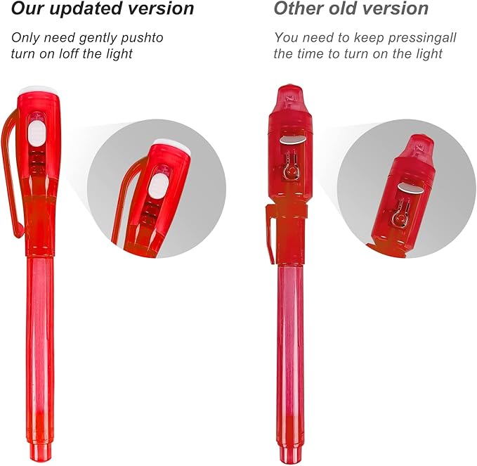 - Upgrade design: the original press type switch was upgraded to the push type switch, which can easily push and light up continuously; our upgrade invisible ink pen can emit more powerful and beautiful beams.