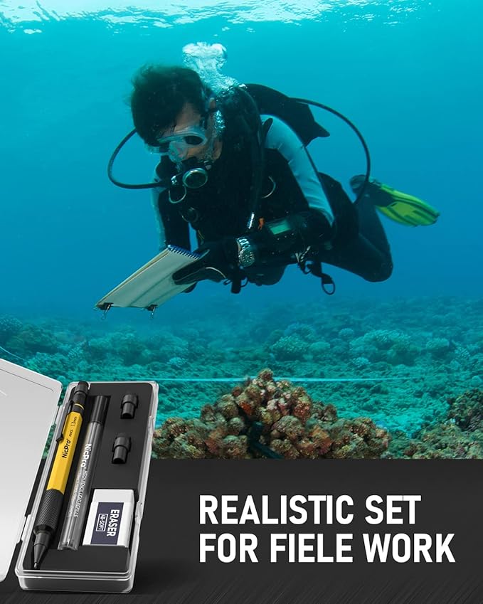 - 1.Mechanical Pencil Set: Come with a 1.3mm mechanical pencil,1pcs 4B eraser, 2pcs eraser refill, 1 tube of lead refills (12pcs/tube),each lead is 120mm long, the full length of the pencil’s barrel.There is also a plastic pencil case included,a realistic set for field work.