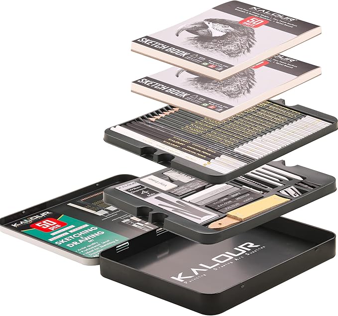 KALOUR 52-Pack Sketch Drawing Pencils Kit with Two Sketchbook,Tin Box,Include Graphite,Charcoal and Artists Tools,Pro Art Drawing Supplies for Adults Beginner Kids