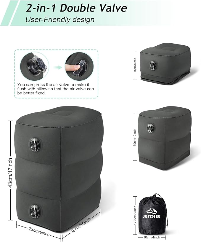 JefDiee Inflatable Travel Foot Rest Pillow, Kids Airplane Bed, Adjustable 3 Layers Height Leg Rest Pillow, Adults Travel Essentials Great for Airplane, Office, Home, Trains, Cars (2 Pack-Dark Grey)