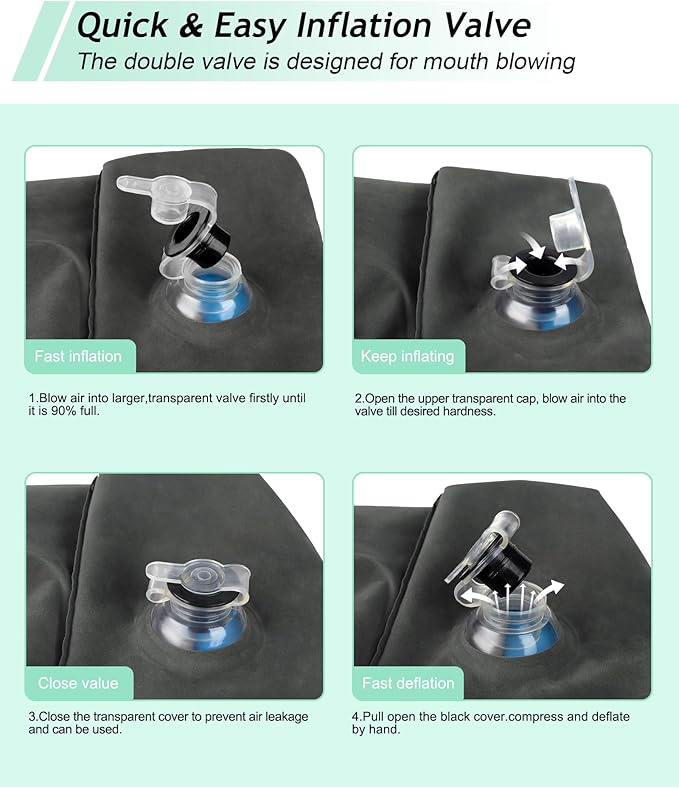 - UNIQUE HUMANIZED DESIGN: This inflatable leg rest has two separate air chambers. The lower chamber for 1 level height, and the upper chamber for 2 level height. With 2 in1 double valve, the upper black air valve is a one way air inlet for inflating or replenishing gas. Bottom transparent air valve can be quickly inflated and deflated. What's more, the double valve is designed for mouth blowing, It only takes about one or half minutes with a few breathes. Release the air only 3or 5 seconds.