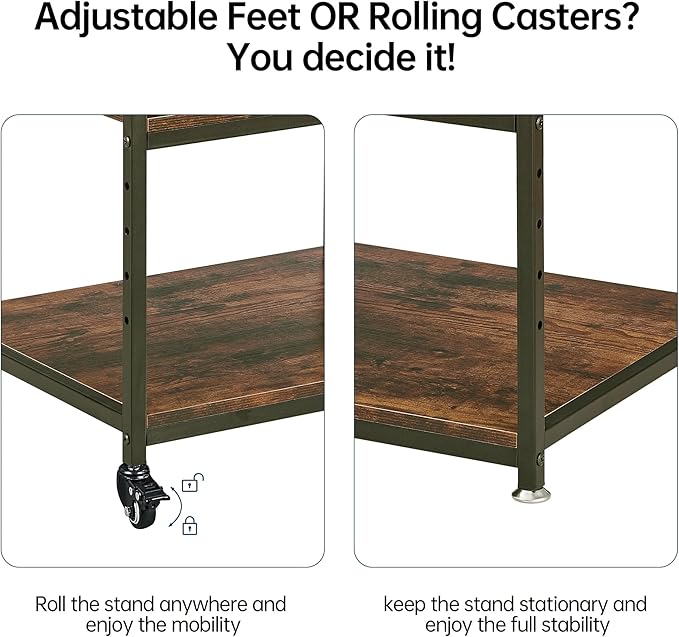 - 【Industrial Grade Casters】Featuring upgraded industrial-grade wheels, this printer cart glides effortlessly even when fully loaded. With all four wheels lockable, the cart can be secured in place firmly. Alternatively, just opt for the included foot pads to keep the stand stationary for complete steadiness. These foot pads can be fine-tuned to prevent wobbling on uneven surfaces, guaranteeing a stable and secure stand.