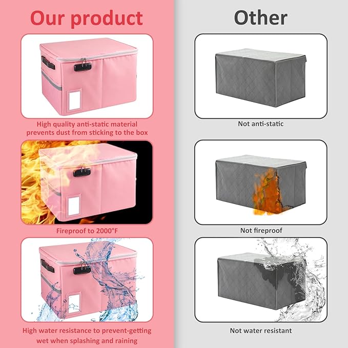 - Fireproof and water-resistant safe: The exterior material of Fireproof File Box is made of upgraded anti-static silicone coated fiberglass, which can withstand temperature up to 2000β. Fireproof Document Box is not only fireproof but also highly water-resistant, so you don't have to worry about your important documents getting wet by rain.(Does not include folders)