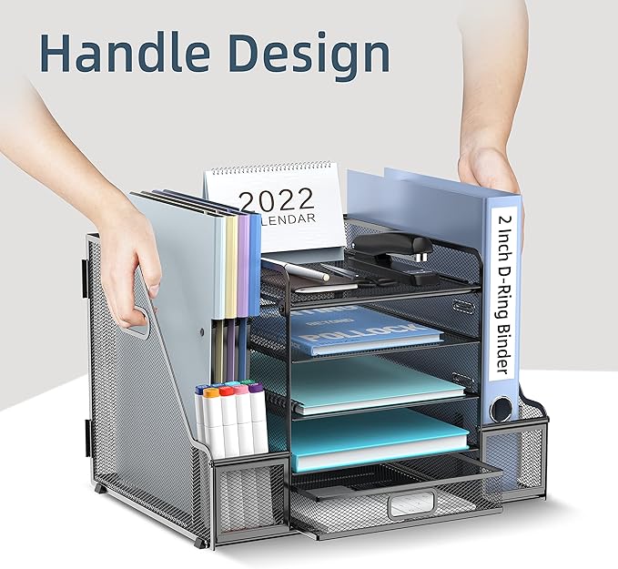 - [Large Capacity File Organizer] This desktop organizer has five tiers, each of which has a lot of space. There is also a lot of space on both sides of the file organizer, as well as the pen holders and drawer, a large file container that can hold books, notebooks, a4 paper, and other small items is ideal for organizing files.