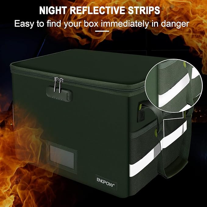- Dust-proof and reflective strip design:Are you still worried about the storage box is often covered with dust? The dust-proof material can prevent dust from sticking to the outside of our fireproof box, always keep it neat and tidy.The reflective strip design on the side of the box allows you to immediately find your fireproof box even at night, protecting irreplaceable documents and valuables from fire.