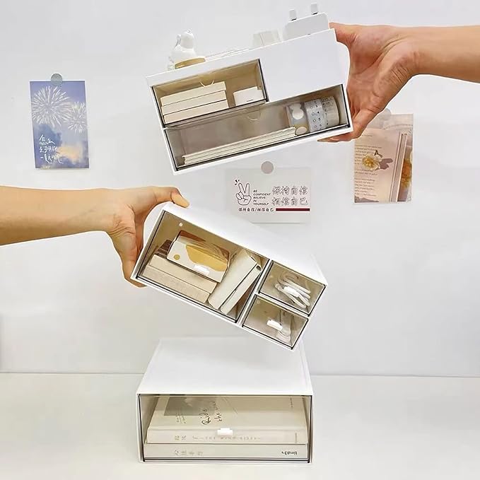 - Stylish white plastic desk organizer with 2 drawers and 4 compartments keeps office supplies organized