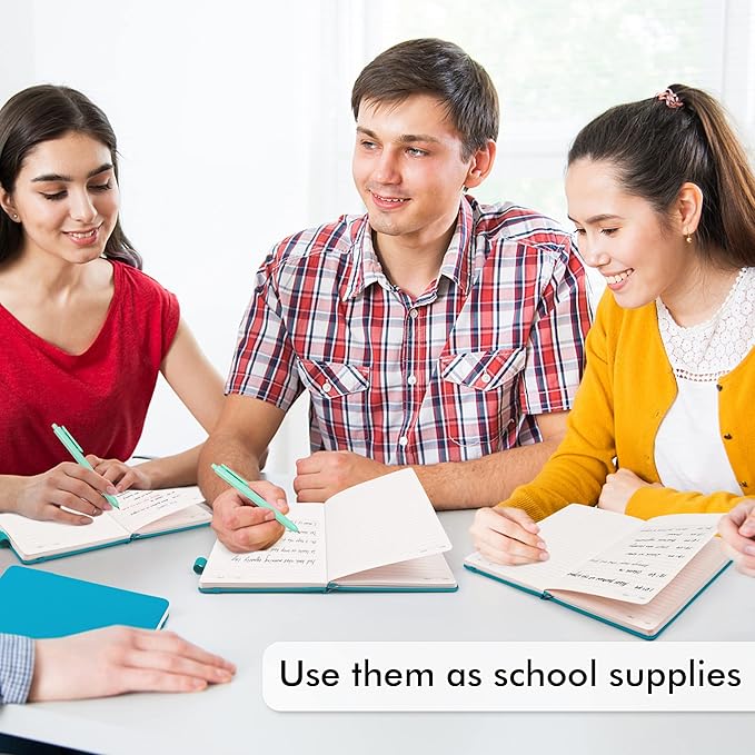 - Feela 3 Pack Classic Ruled Notebooks contains 3 teal ruled sturdy cover notebooks and 3 Black Retractable Pens. Each of the notebooks measures 8.3” x 5.1”, which is perfect to carry and easily held by young girls and boys. These black cute pens are customized to be placed in the pen holder, which is pretty convenient.
