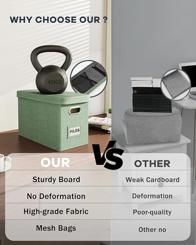 - 【Sturdy & Stackable】Portable storage box is made of well-made linen fabrics and durable material, with good support and bearing capacity, and the box top can withstand 100 lbs. The document boxes can be stacked when in use, or folded for easier storage when not in use.