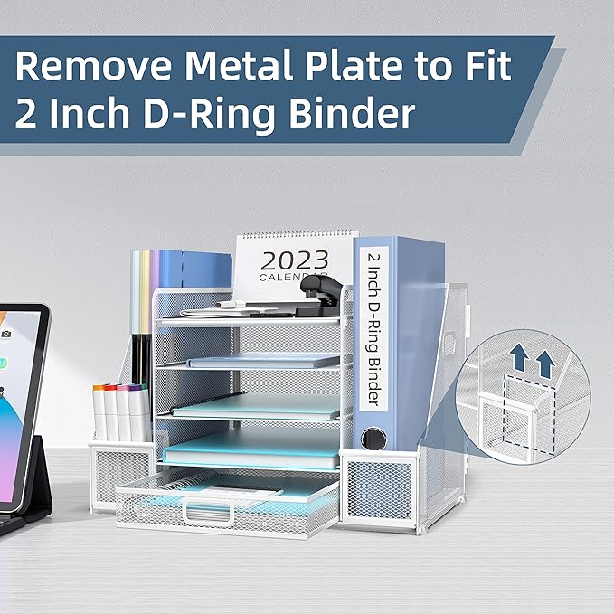SUPEASY Mesh Desk Organizer with File Holder, 5-Tier Paper Letter Tray Organizer with Magazine Holder, Desktop Organizer and Storage with Drawer for Office Supplies Home or School, White