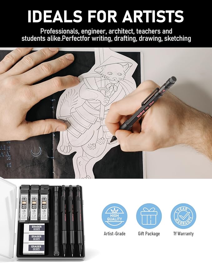 - 100% RISK FREE PURCHASE: If you are not satisfied with Nicpro mechanical pencil set , weβre very happy to either provide a no-questions-asked Refund or Replacement. Order today risk free TipsοΌFor 0.9mm models, use only one lead at a time for best performance